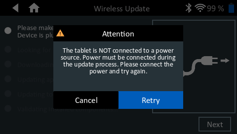 An Attention screen is displayed if the Controller is not connected to power when you try to begin a software update.