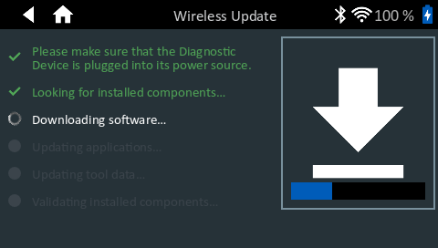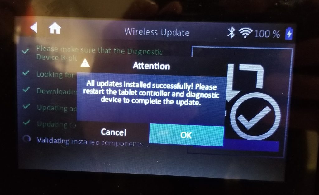 Not pictured, you will get a Warning message if the internal AA batteries inside the Tester Pod are too low telling you to replace the batteries before you can continue with the software update.